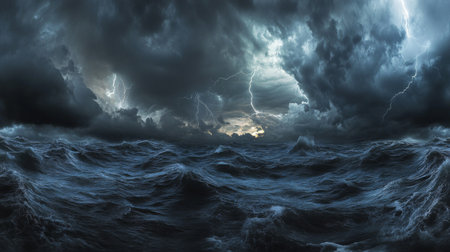 A panoramic view of a stormy sea with lightning illuminating the dark clouds, creating a dramatic and electrifying contrast between the storm and the ocean.