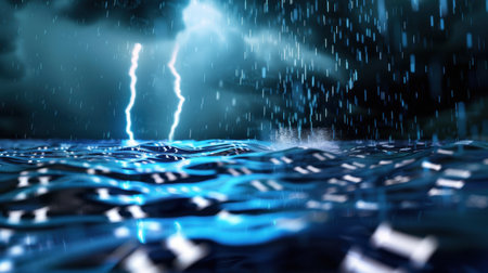 A captivating scene showcasing heavy rain pouring down on turbulent ocean waters, illuminated by striking lightning, capturing nature