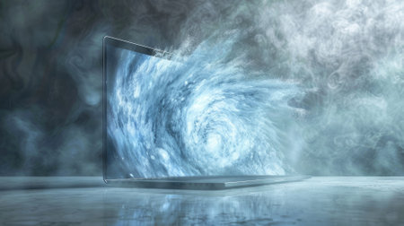 Laptop with swirling vortex emerging from screen amid mist