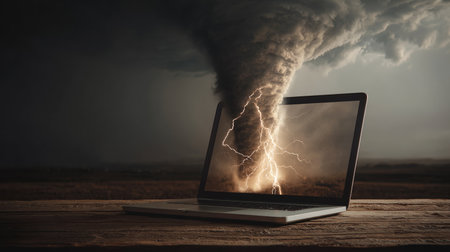 Open laptop on a wooden desk with photorealistic dramatic weather scene bursting from screen: vivid lightning bolts, swirling thunderclouds, and a small tornado funnel merging into real space.