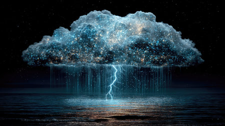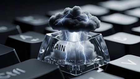 A dark, dramatic image features a storm cloud with lightning emanating from a computer keyboard key. The composition uses close-up perspective and selective focus, showcasing textures and details. The colors are predominantly grayscale, with flashes of bright light. It might be used for technology, weather-related themes, or visual storytelling.