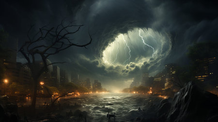 An ominous storm cloud formation dominates the sky above a distant city. The image showcases swirling patterns of dark clouds and striking lightning. The composition suggests an outdoor environment, with potential use for conceptual designs or disaster-related themes. The scene evokes a feeling of impending weather.