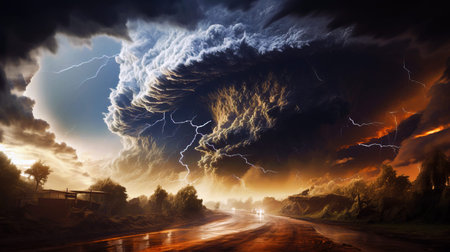 Scenery of massive tornado, huge cyclone, apocalyptic feeling. Thunderstorm landscape of natural disaster. Global earth ecology problem, climate change concept. Gen ai illustration. Copy ad text space