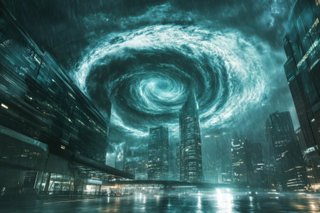 A powerful storm swirls above towering city buildings, illuminated by the glow of lights in the rain.