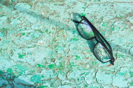 Classic eyeglasses on green background. Top view.