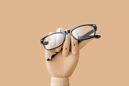 Wooden hand with glasses on color background
