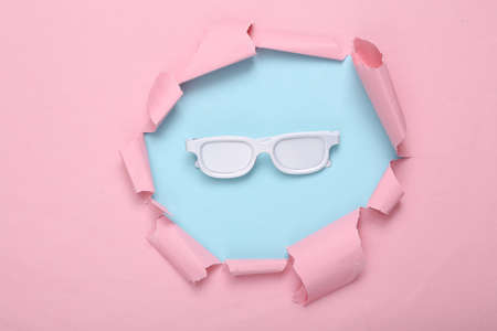 creative fashion layout. White sunglasses through torn hole of pink blue paper. Pastel color trend. fresh ideas. minimalism. concept art. flat lay. top view.