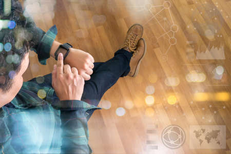 Man hand touching a smart watch virtual icon. Communication and use of modern Internet technology metaverse, Social Networking, online marketing, digital online. Concept technology.