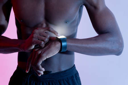 Unrecognizable young black guy with muscular naked torso checking his fitness tracker in neon light