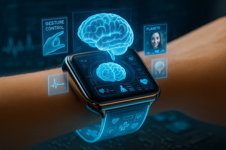 AI generated image of a sleek concept smartwatch projecting a glowing 3D human brain hologram with floating medical data and interactive health interfaces
