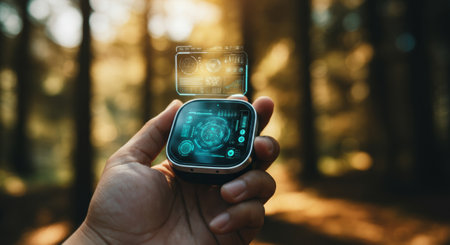 Futuristic smartwatch with augmented reality display in outdoor forest setting.