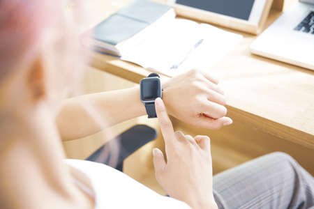 Hand of Woman use Wireless Digital Touchscreen Smart Watch Wearable Gadget Device with Hologram of Text Remind on wood Table as Business Modern Technology Lifestyle Concept