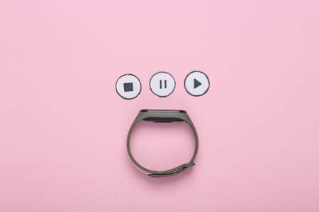 Smart bracelet with icons start, stop, pause of media player on pink background. top view