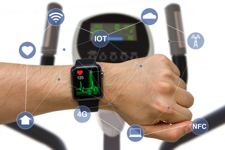 Smart Watch Monitoring Heart Rate Application Concept While Exercising with Elliptical Machine