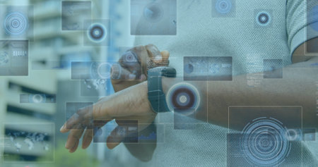 Image of data processing on screens over biracial man checking smartwatch. Lifestyle, data processing, communication and technology concept digitally generated image.