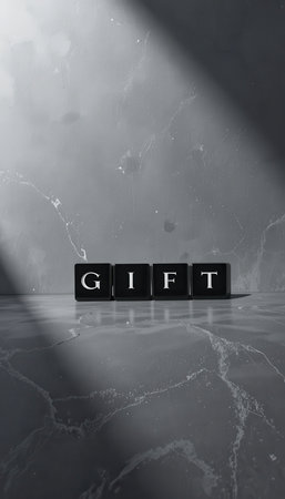 A minimalist black and white image showcasing the word GIFT in block letters resting on a marble surface with elegant shadows, perfect for celebrating special occasions.