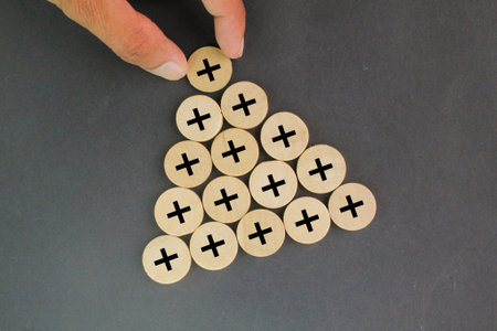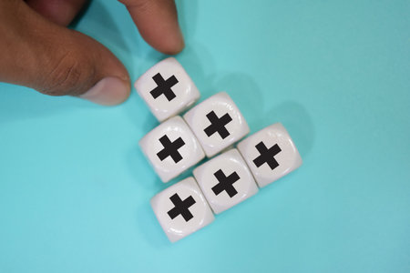 Mans Hand Placing Wooden Block with Plus Sign, Concept of Decision, Choice, and Positivity