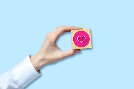 Female hand in a white shirt holds a wooden cube with a social heart icon. Isolated. Love symbol.Social media. Network.