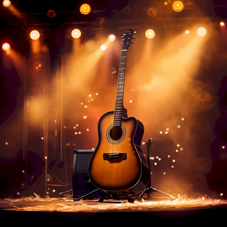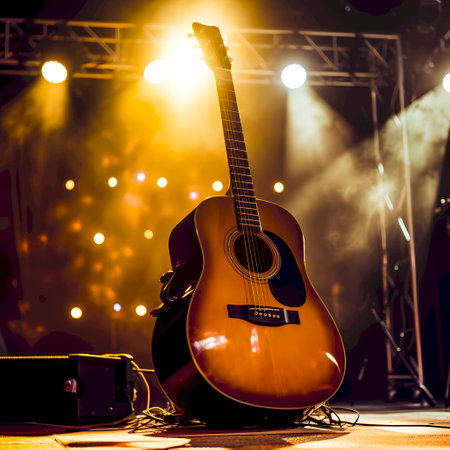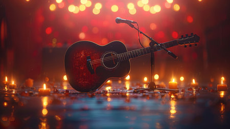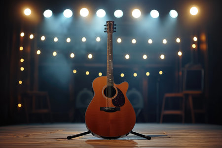 Intimate stage setup acoustic guitar, microphone, spotlight, setting the mood for live performance