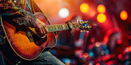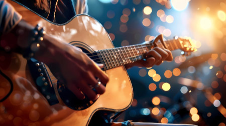 A close-up shot of a guitarists hand playing an acoustic guitar on stage, illuminated by bright stage lights.