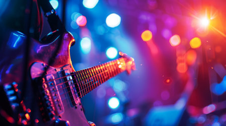Close-up of an electric guitar with colorful stage lights in the background. Vibrant and dynamic music scene.