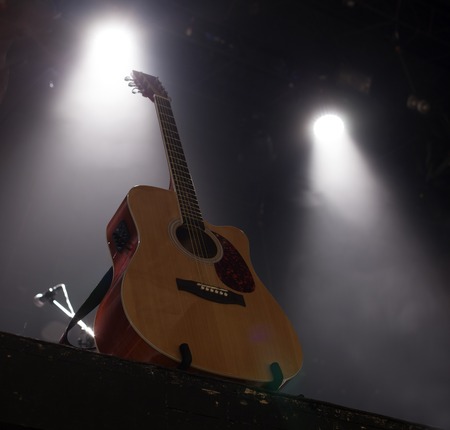 Acoustic guitar on stage with spotlights. Vintage style. Music concept.