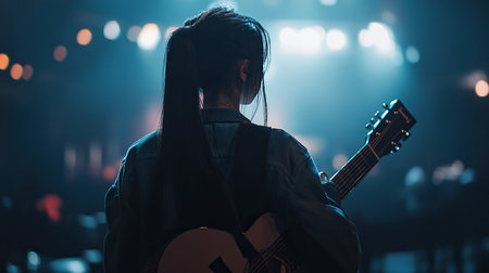photo of an Asian woman model in a musician's outfit, back view holding a guitar, concert stage blurred in the background, moody lighting creating a dramatic tone, focus on her posture, advertising shoot, professional photo, photorealistic --chaos 10 --ar 16:9 --v 6.1 Job ID: b808fe88-6e8c-4484-a497-f8c7b7aacf98