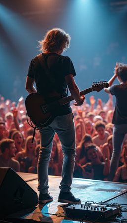 A passionate guitarist stands center stage, backlit by vibrant blue lights, as an enthusiastic crowd cheers in the background. The electrifying atmosphere captures the essence of live music, where the connection between the performer and audience creates an unforgettable experience.