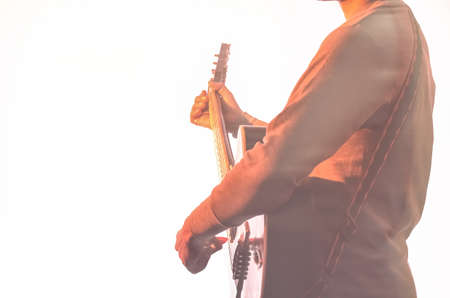 The guitarist plays the guitar in the spotlight. Hands of a Guitar player playing the guitar. Selective focus. Soft focus