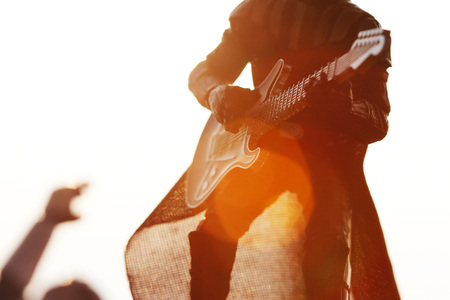 Electric guitar guitarist playing. Text is written digitally. It has 4 layers.
