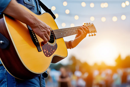 Musician strumming guitar at outdoor concert during sunset warm lights glowing above creating vibrant evening concept of live music entertainment venues music festivals.