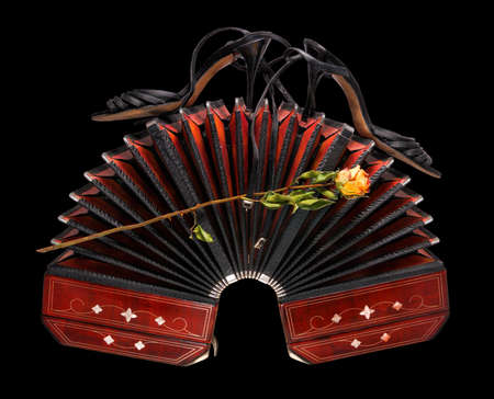 Wide open bandoneon with tango shoes and a dry rose, isolated on black background