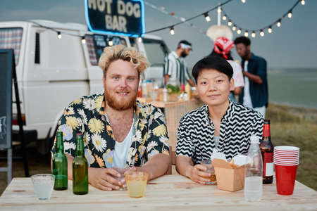 Young people buying hot dogs for lunch while they spending time on the beach