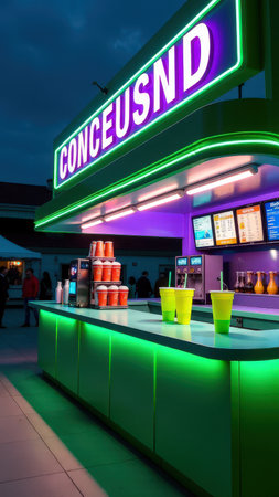 Neon-lit outdoor beverage stand with bright green and purple sign at night.