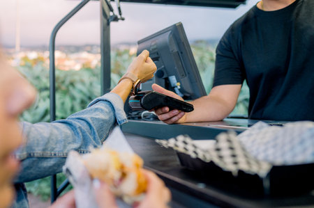 Food Truck Employee Hands Out Card Terminal to a Young Man in Leather Jacket. Indian Man is Using Contactless Bank Credit Card to Pay for Food. Street Food Truck Selling Burgers Outdoors.