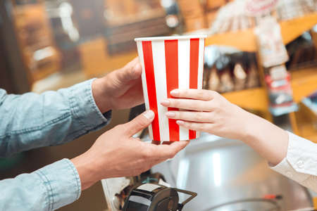 Hands of young female vendor passing big purple paper box full of popcorn while selling it to one of spectators in cinema