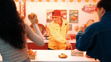 Restaurant coworker with yellow shirt and red cap dancing while service customer. Professional waiter moving to music with lively tone while looking at diverse people enjoy eating food. Regalement.