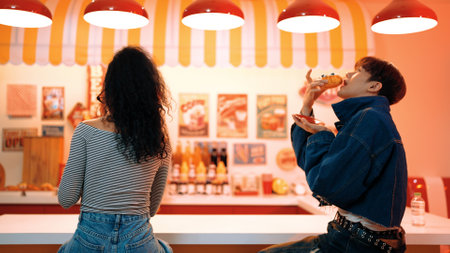 Happy diverse customer sitting and waiting for waiter serving food. Multicultural people waiting and eating fast food and talking with his colleague while wearing casual shirt. Happy meal. Regalement.