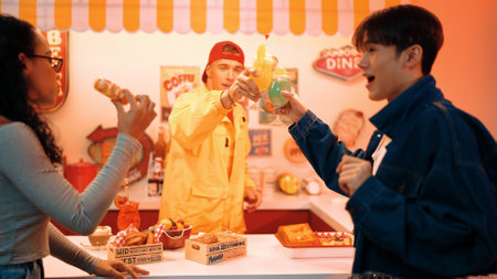 Happy man with yellow shirt turn around to pick and add tabasco sauce in to food while standing behind bar. Attractive diverse friend talking and enjoy eating while holding glass of juice. Regalement.