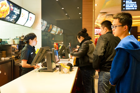 MACAO - FEBRUARY 16, 2016: customers in McDonald's restaurant. McDonald's primarily sells hamburgers, cheeseburgers, chicken, french fries, breakfast items, soft drinks, milkshakes, and desserts