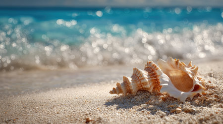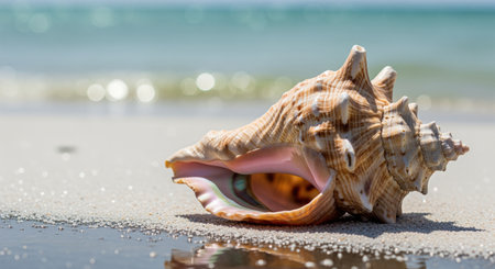 A stunning close-up view of a seashell resting on a gentle beach, with sparkling water reflecting the sunlight and soft sand surrounding it.
