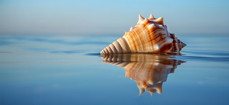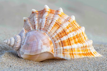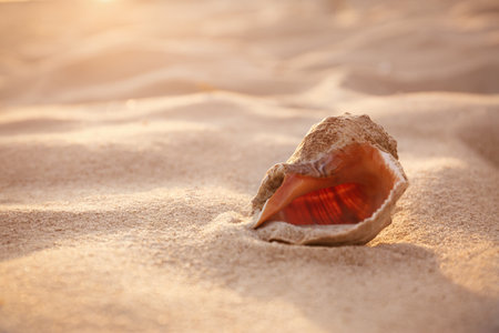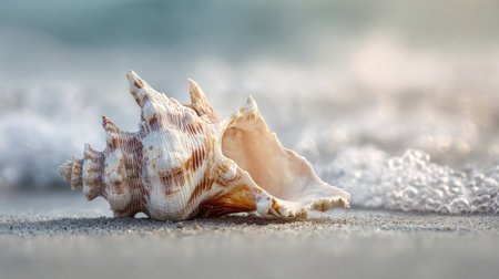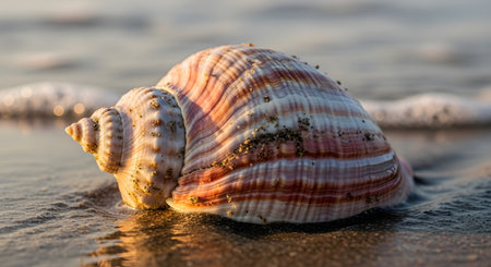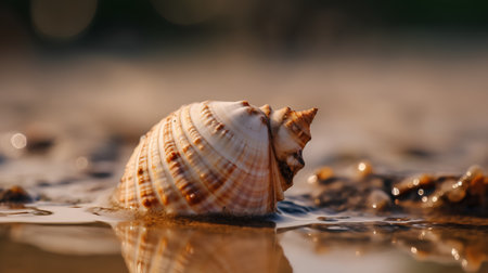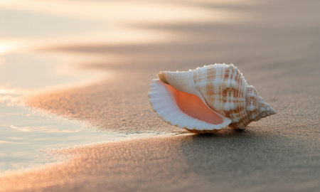 Elegant seashell resting on damp sand at the ocean edge during golden hour sunset. soft light illuminates the intricate patterns of the conch shell, reflecting on the wet beach surface. serene coastal scene symbolizing peace and summer vacation.