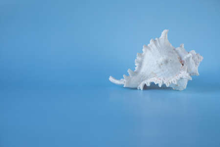 A white shell on a blue background. A white shell on a blue background. Space for copying. Seashell shell spiral beach ocean on a blue background travel vacation tropical.