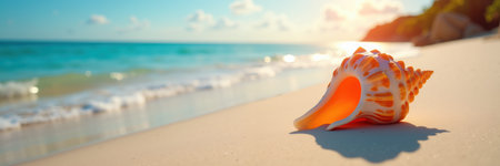 A vibrant seashell rests on a sunlit sandy beach, with gentle waves and a sparkling ocean in the background.