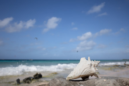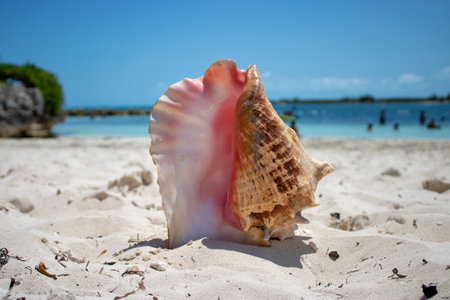 Close up of a large beautiful shell on a tropical sandy beach with a blurred background taken on a beach in The Caribbean