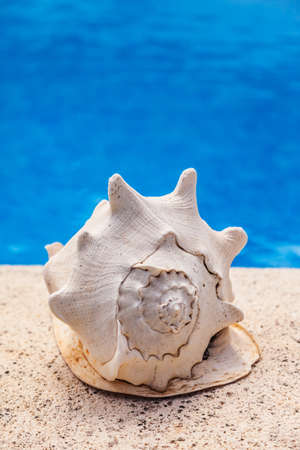 Seashell on the summer beach in sea water. Summer background. Summer time.