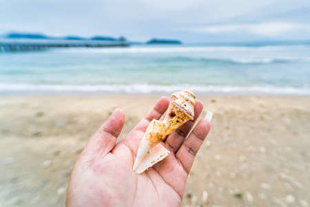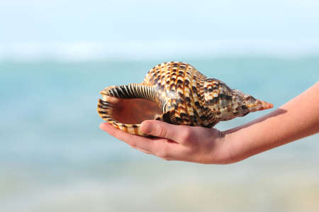 summer sea shell at the beach. summer vacation. seashell exotic tropical molluck. mollusk in sea or ocean. hand with shell.