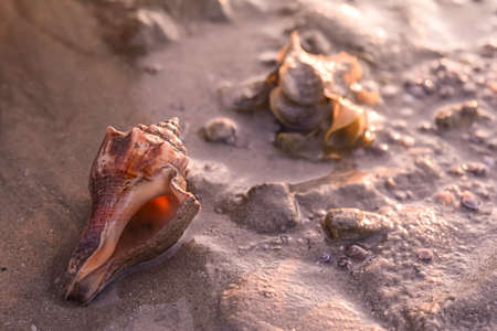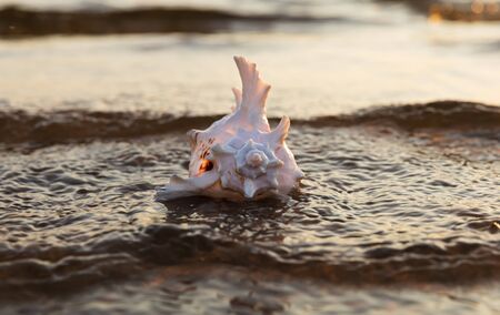 Beautiful sea shell in the water at sunset. Shallow depth of field