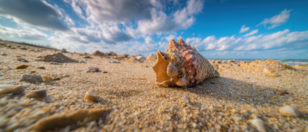 Captivating image of a beautifully detailed shell resting on soft sand, set against a clear blue sky and gentle clouds, ideal for nature and coastal themes.