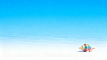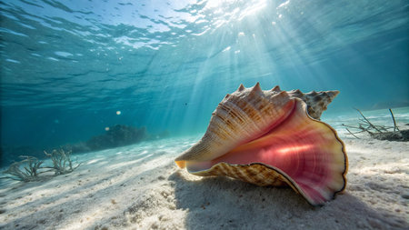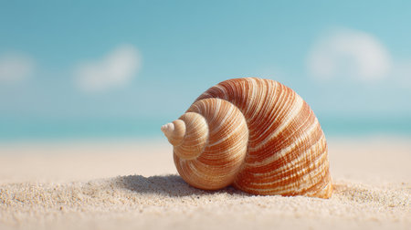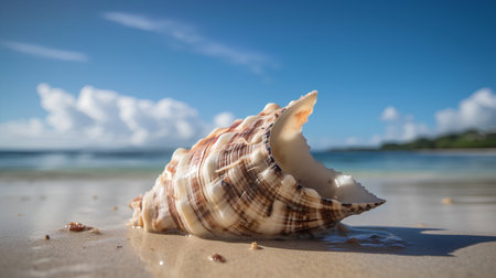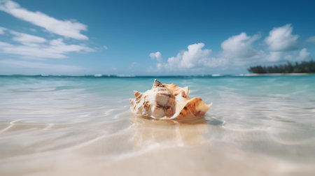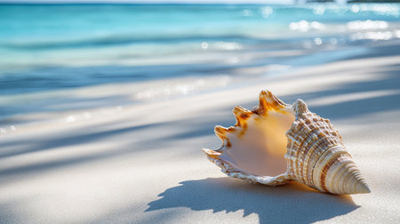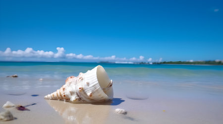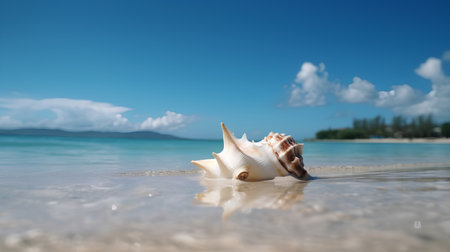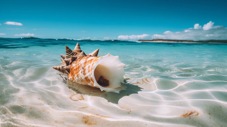 Conch shell resting on a pristine white sand beach. clear turquoise ocean and bright blue sky create a serene tropical paradise scene, symbolizing summer vacation and tranquility.